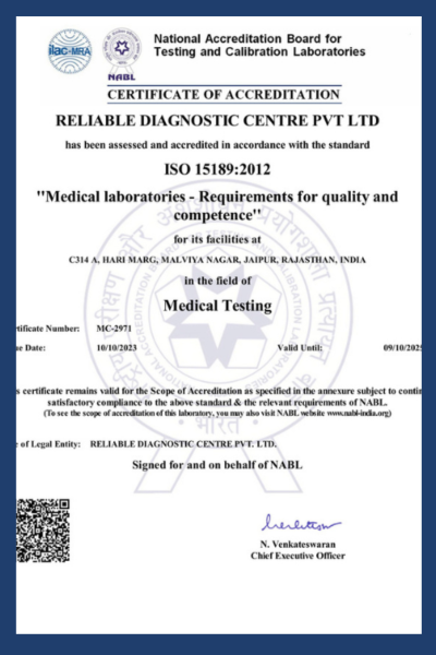 The accreditation of Reliable Diagnostics by NABL (ISO 15189) validates our ability to perform high quality clinical testing and clinical interpretation to international quality standards in every facility that we operate.